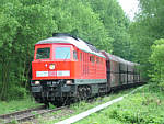 | 03.08.2006 20:10 Uhr Eine der TSD (Transport-Schienen-Dienst GmbH) ex V100.1 der DR mit 2 Schotterwagen voraus - Einfahrt ins Angertal |