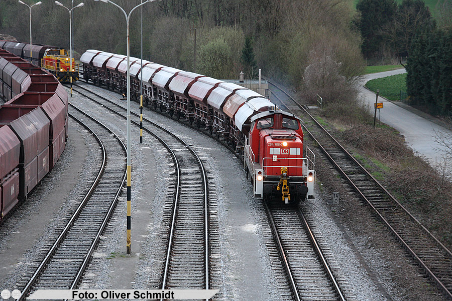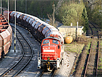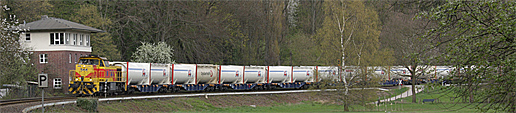 | Seit Anfang des Jahres ist festzustellen, dass das Verkehrsaufkommen auf der Angertalbahn wieder anzieht. Der im Jahr 2009 recht stille Samstag, zeigt auch wieder Verkehr am frühen Nachmittag. Die Züge nach Beverwijk fahren scheinbar jetzt täglich. Hier hat sich aber dann die Zahl der Züge "halbiert". Wurden bisher morgens die Lok(s) nach Rohdenhaus gefahren um die Kalkzüge abzuholen und fuhren nachmittags nochmals mit den Leerwagen ins Angertal, erfolgt jetzt die Zuführung der Leerwagen am Nachmittag und auf der Rückfahrt werden die beladenen Wagen mitgenommen. | |
