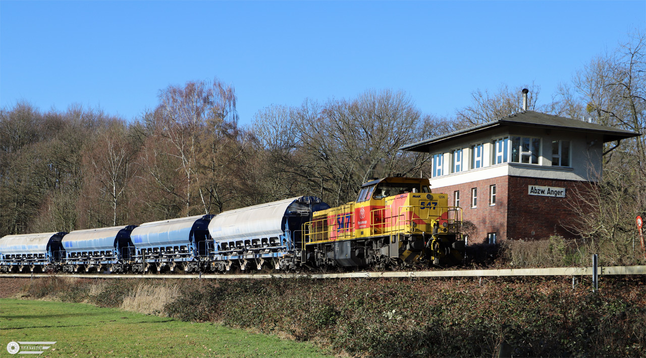 | ThyssenKrupp Lok 547 mit Leerwagen an der ehemaligen Abzweigstelle Anger | ||