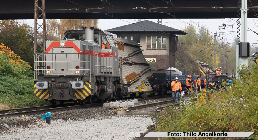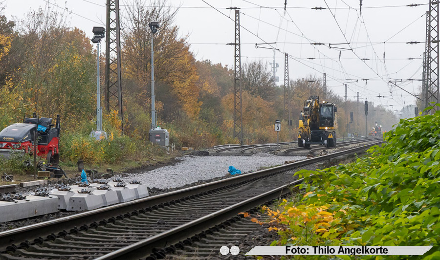 | 8.November 2025 - Auswechslung der Weiche ins Angertal durch KAF Falkenhahn - Im Hintergrund auf der Angertalbahn: Schwellenwechsel durch EIFFAGE. | |