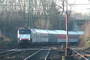 | Seit 1. Februar ist 189 090 (ex Railion) jetzt MRCE vermietet an DB AutoZug (Datenquelle www.privat-bahn.de) die Stammlokomotive für diesen Zug. In den ersten Tagen wurde jeweils der Abschnitt Frankfurt - Emmerich gefahren. Die Aufnahme entstand am 8.Februar 2008. An diesem Tag wurde bis Amsterdam mit 189 090 gefahren (Quelle Forum DSO) . | ||||||||