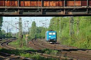 | rechts Düsseldorf-Rath Blickrichtung Ratingen mit im Bild links: Gleise der S6 des VRR LTE 185 529 verlässt gerade Düsseldorf-Rath |
