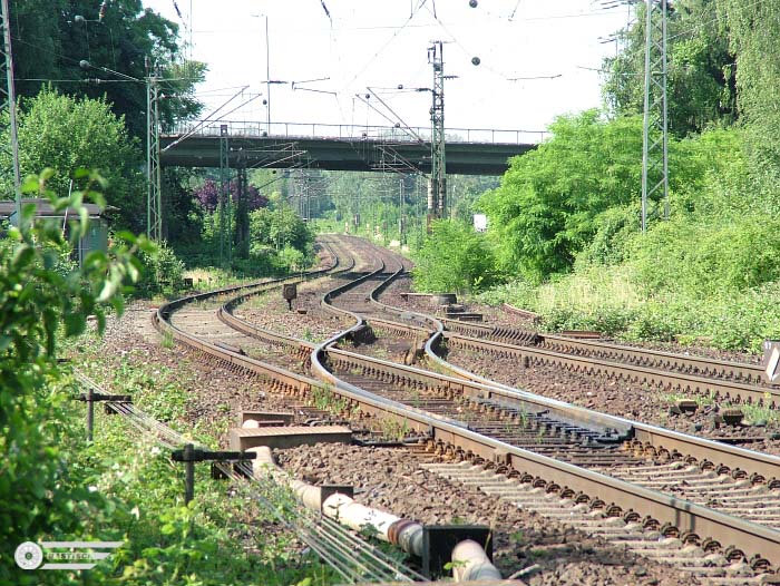 Blick vom Bahnübergang Sandstrasse in Ratingen Richtung Süden. Links im Bild der ehemalige Schrankenposten des Bahnübergangs Volkardeyer Strasse. freigeschnitten |