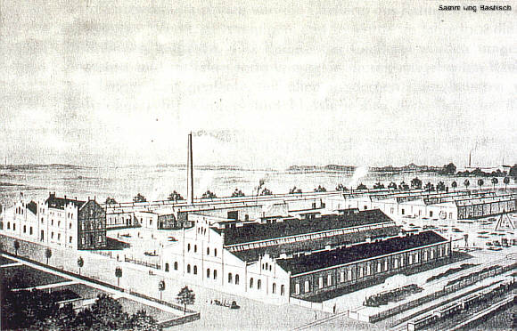 Zeichnung des Unternehmens 1909 Im Vordergrund ist eine Halle hinzugekommen. |