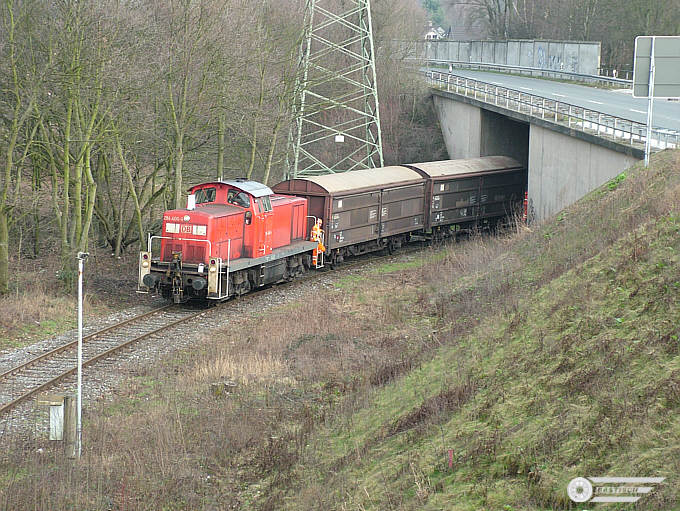 | Ungefähr bei km 12,0 zweigt das Gleis zum Anschluss auf der Ostseite ab. 17.03.2008 Zustand: Es sieht nach "stillgelegt" aus. 2009 Zustand abgebaut bis auf ein kurzes Teilstück. Heute nicht mehr vorstellbar: Ganze Autozüge hatten als Ziel Lintorf >>KLICK Ganzzug VW-Golf |