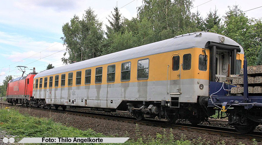 | 19.Oktober 2009 - 120 502 (in gelb >>KLICK) mit RAILab durch Lintorf Fahrtrichtung Düsseldorf. RAILab steht für Rollendes Analyse- und Inspektionslabor, von denen der DB zur Zeit zwei zur Verfügung stehen. DB Systemtechnik überprüft mit diesen Messzügen die Gleisgeometrie auf Unregelmässigkeiten. |