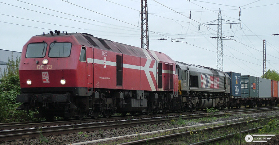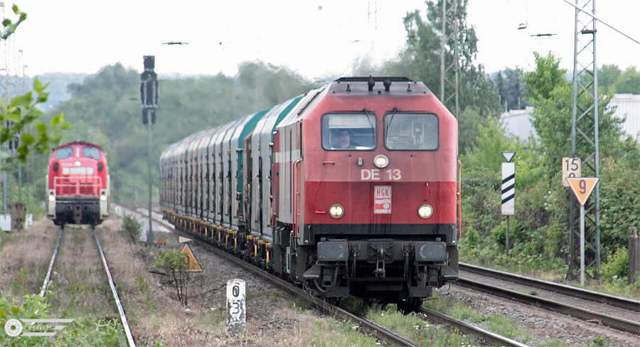 | DE 13 am 22.Juli 2008 Lz durch Lintorf Richtung Duisburg. Eine Woche später musste die Lok, die letzte ihrer Bauart, angeblich mit einem Motorschaden abgestellt werden (am 3.August 2008 wieder in Lintorf gesichtet). |