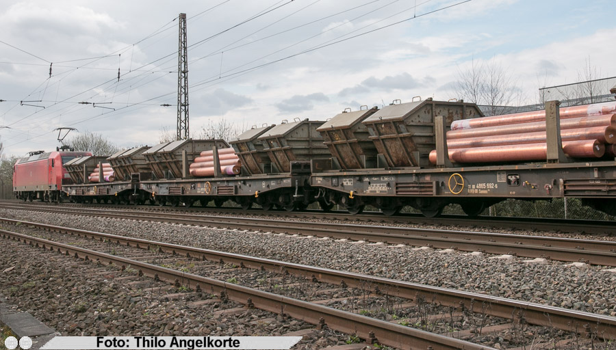 | 20.Oktober 2012 - 14:20 Uhr - nahe km 16,8 Umleiter (Regelfahrweg über Neuss - Duisburg Rheinhausen) von Nievenheim kommend 185 697 (NOVELIS-Werbung) Fahrtrichtung Duisburg. Im Internet findet sich zwar einiges zu diesem Zug, allerdings eine vollständige Information ist nicht vorhanden. Dieser Alu-Pendel verbindet die NOVELIS Produktionsstätte Aluminium Norf GmbH mit den Standorten in Göttingen und Nachterstedt. Die Loks bleiben jedoch nur bis Nordhausen am Zug. Der Zugverband besteht im wesentlichen aus Tragwagen des Typs Sgmmns der Ahaus Alstätter Eisenbahn und Shimmns der SBB. |