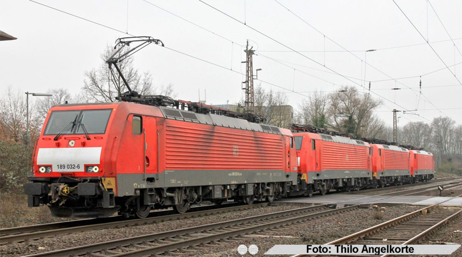 | 03.03.2013 - 189 032 mit 189 038, 189 036 und 189 073 am Bahnübergang Sandstrasse in Ratingen auf dem Weg Richtung Norden. Die Lokomtiven waren am Vortag mit Erzzügen auf dem Weg ins Saarland >>KLICK | ||