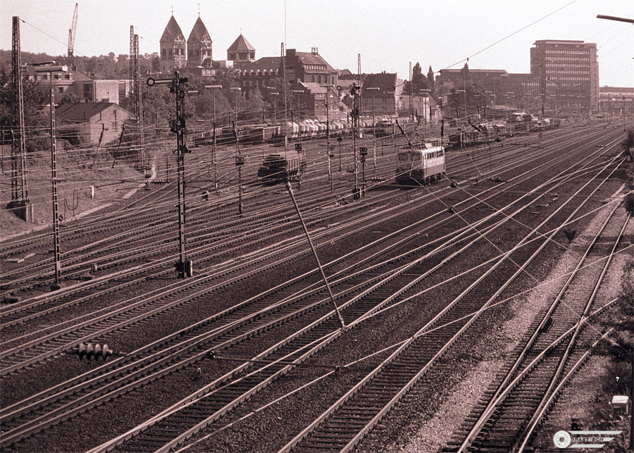 | Ein Blick zurück auf den 1.August 1986. Noch gibt es die Weichenverbindungen zwischen der Güterzug und der Personenzugstrecke. Sie ermöglichten es, den Bahnsteig von Rath auch von der Westbahn aus anzufahren, bzw. von dort Richtung Ratingen West zu fahren. | |