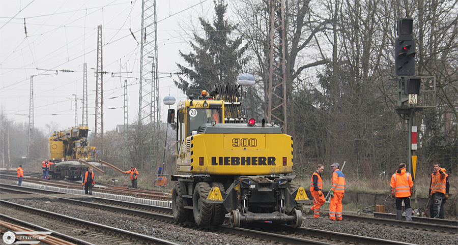 | Lintorf - Weiche 03W11 ist bereits eingebaut. Der Gottwald-Kran von Kölngleis transportiert gerade das Übergangsstück für das Richtungsgleis Duisburg heran. | |