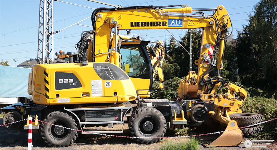 | LIEBHERR 922 rail - Kleinwagen Nr. D-FRANK 99 80 99 03 710-8 Zweiwegebagger Beutlhaus-Frank, Meckenheim (Vermieter) angebracht waren Aufkleber "AD Gleisbau Mittelrhein GmbH" | |