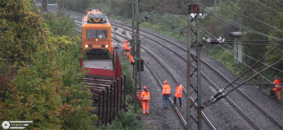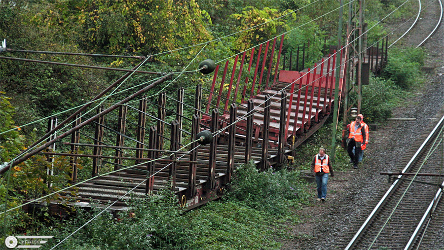 Blick von der Brücke der Volkardeyer Strasse auf 3 Waggons, von denen mindestens zwei Kontakt zum Grünzeug gesucht haben