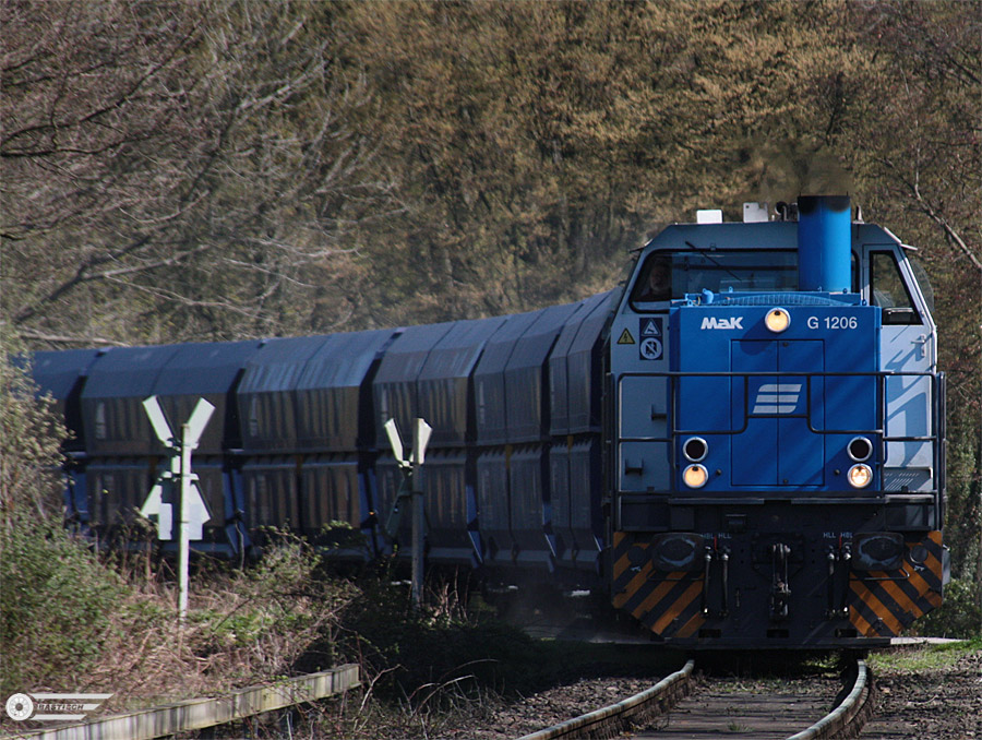 02.04.2011 - 12:42 Uhr - Die beiden Miet-G1206 mit Kalkzug am Bahnübergang nahe "Haus zum Haus"